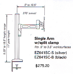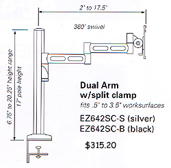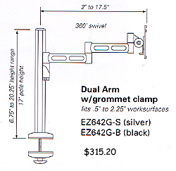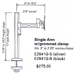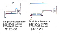 eZ-ARM's moving parts are engineered to exact tolerances, providing a snug, stable arm that does not suffer from sag or slop. However the monitor can be easily adjusted to a new position with little effort. Available in single and dual arm versions, and in silver and black. |