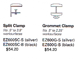 Quickly clamps to worksurfaces 0,5" to 3,5" with Split Clamp. Grommet Clamp allows mounting to worksurfaces 0.5" to 2.25" thick.
